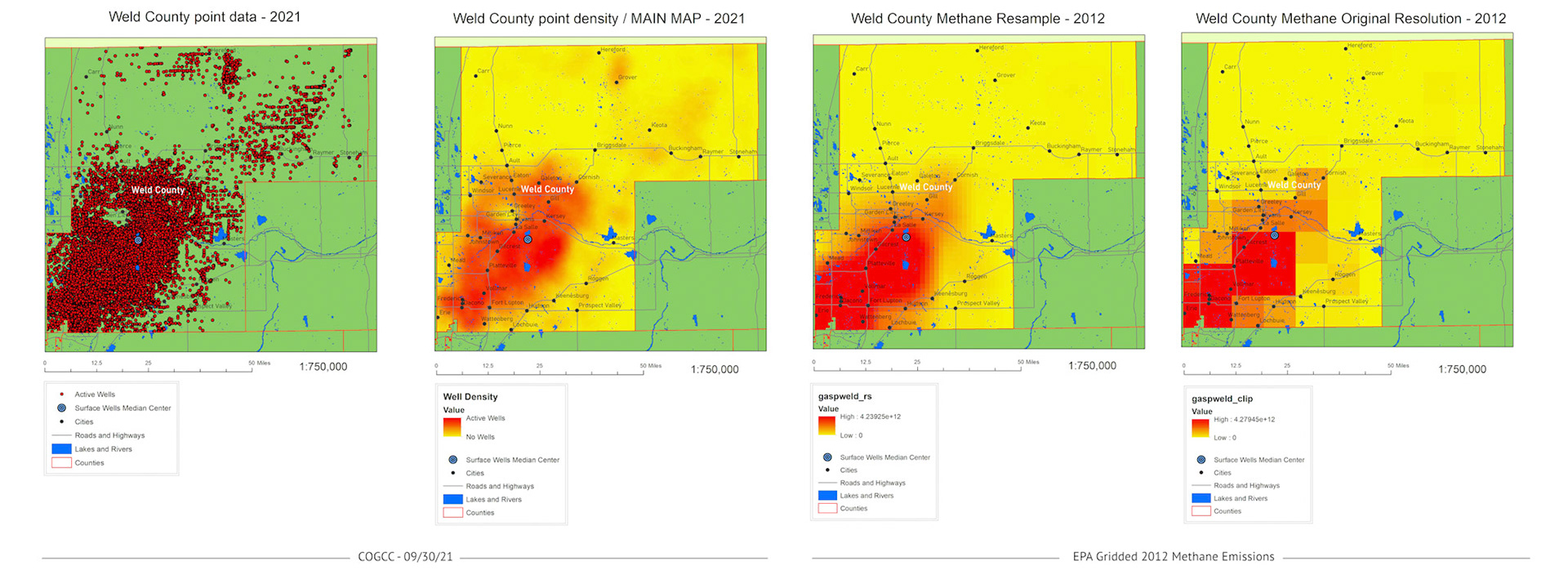Regional (local to Colorado) methane data is difficult to find. Though nationwide and global methane data was easier to access, the scale of that data did not have the local resolution needed for regional analysis. Surface wells extracting natural gas (fracking) is a known methane producer, so as a proxy to actual regional methane data, I acquired statewide surface well data from the Colorado Oil and Gas Conservation Commission (GOGCC).